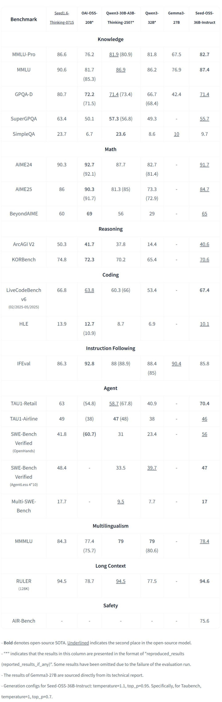 Seed-OSS 使用了 12 万亿(12T)tokens 进行训练,并在多个主流开源基准测试中取得了出色的表现。