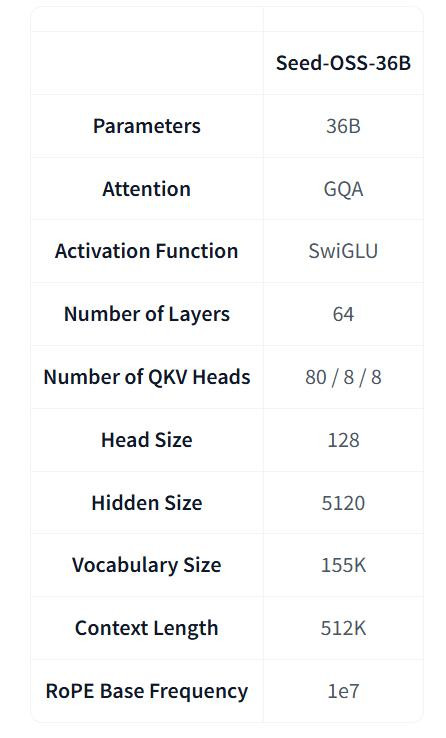 Seed-OSS-36B 的架构结合了多种常见的设计选择,包括因果语言建模、分组查询注意力(Grouped Query Attention)、SwiGLU 激活函数、RMSNorm 和 RoPE 位置编码。