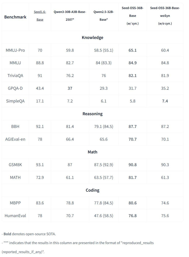 基准测试结果显示,Seed-OSS-36B 位列当前性能较强的开源大模型之列。