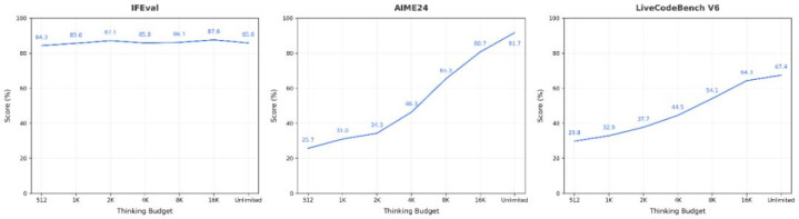 灵活的推理预算控制:允许用户根据需要灵活调整推理长度。这种对推理长度的动态控制能力,可在实际应用场景中提升推理效率。